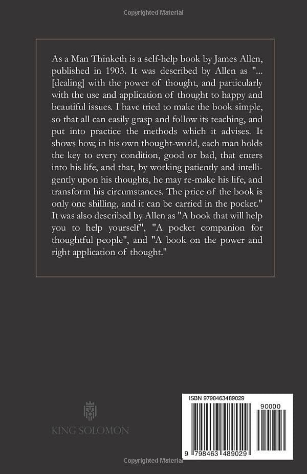 As a Man Thinketh is a self-help book by James Allen, published in 1903. It was described by Allen as "... [dealing] with the power of thought, and particularly with the use and application of thought to happy and beautiful issues. I have tried to make the book simple, so that all can easily grasp and follow its teaching, and put into practice the methods which it advises. It shows how, in his own thought-world, each man holds the key to every condition, good or bad, that enters into his life, and that, by working patiently and intelligently upon his thoughts, he may remake his life, and transform his circumstances. The price of the book is only one shilling, and it can be carried in the pocket." It was also described by Allen as "A book that will help you to help yourself", "A pocket companion for thoughtful people", and "A book on the power and right application of thought."